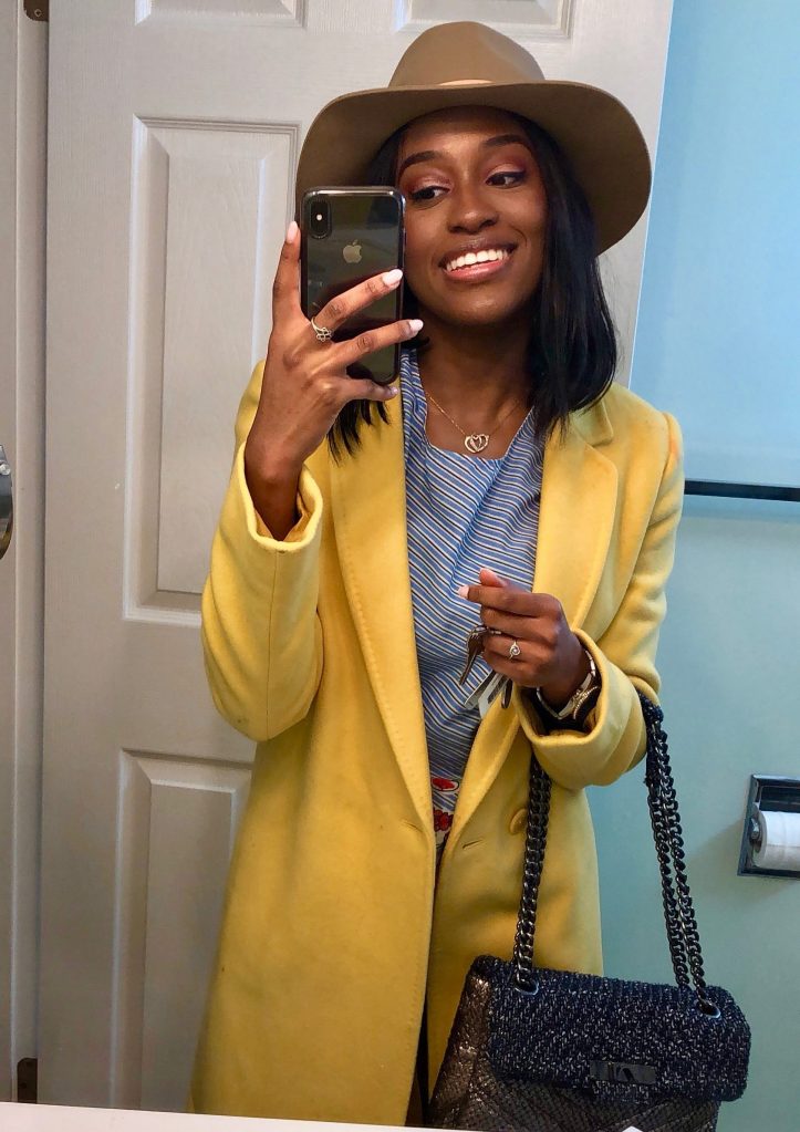 OutFit 3- Yellow Mustard: On one of those nights, I wore this top and pants and received a number of compliments on my jumpsuit. I knew then to recreate the look so, I switched it up a little and wore the shirt under (not a jumpsuit, lol). Typically, mustard is a fall color but, pairing those colors with this yellow coat made it look more spring-like to me.