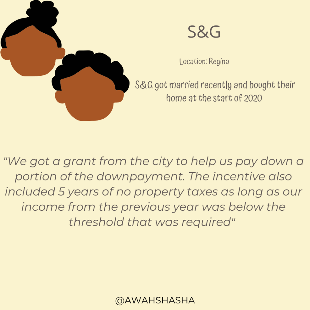 S: Essentially the city of Regina, was offering a grant for $10k for 2 bedroom houses and $15k for 3 bedroom houses under a housing incentive program. This was to incentivize developers of new properties in the city. Part of the grant also included 5 years of no property taxes and you could get this as long as your income from the prior year (based on your notice of assessment) was below a certain amount. I had just graduated so I had little income and my husband’s pay from the prior year was low enough that we qualified (if we had waited for an additional year, neither of us would have qualified). We used that to our advantage before our income went up the next year.