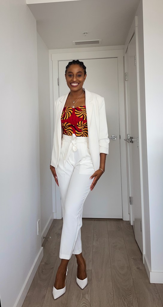 - With a plain colored suit: When I was styling this, I initially wanted to wear this with just the white pants to but the suit looked equally nice and I decided to share both. Interested in spicing up your office look a bit and don’t want to go for yet another plain colored camisole, shirt or satin shirt, try out an ankara top under your blazer or suit. Switch the shoes and take off the blazer for a more casual look.