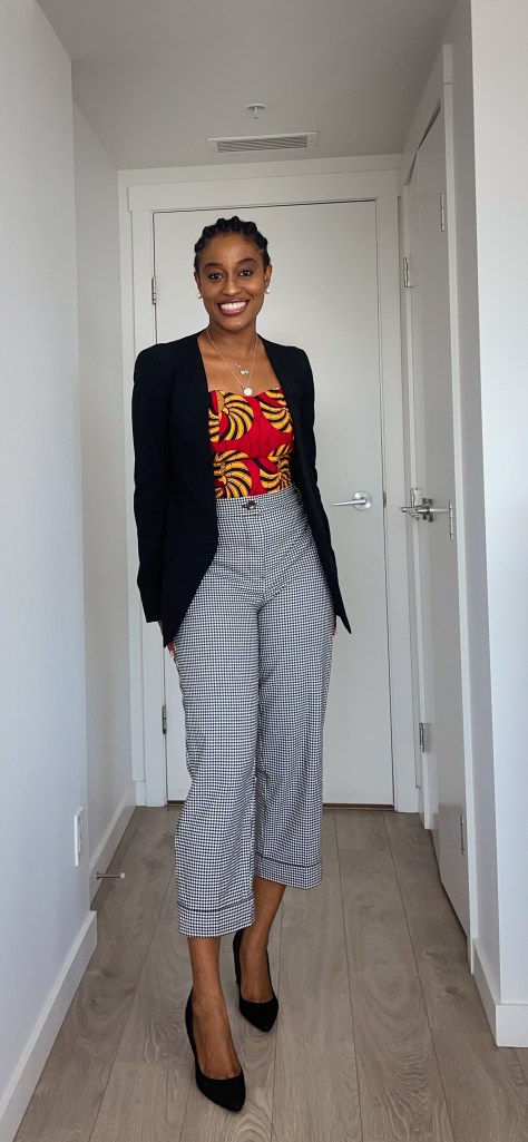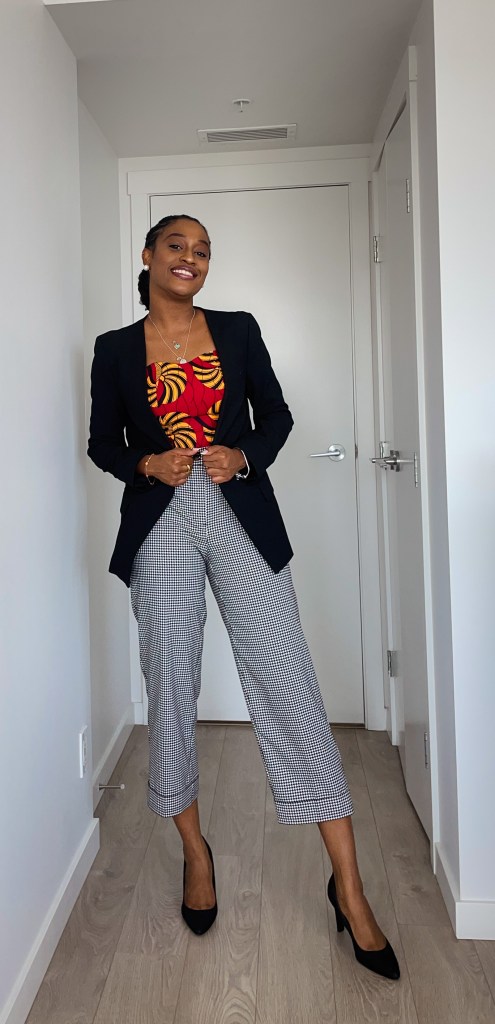 - Pair with patterned pants: For this look, I wanted to explore mixing prints. I know it can be very tricky mixing prints but when you finally find the prints that go well together, this could elevate your outfit and make the look very unique. I paired this with houndstooth pants and a black blazer and I’ll let you decide if this is something you are feeling or not.