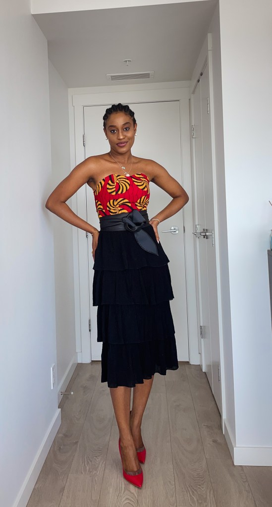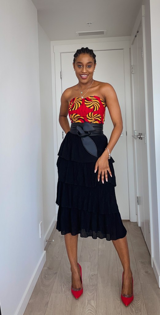 - With a Black layered skirt: I totally recommend this look if you want to dress up this top a bit. I would wear this for date night or a ball or gala. The layered skirt isn’t too extra so it compliments this top very well without stealing the attention from the top. Added red shoes too to be on brand with the red lol.