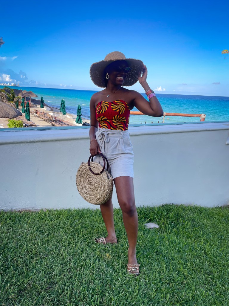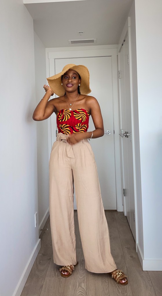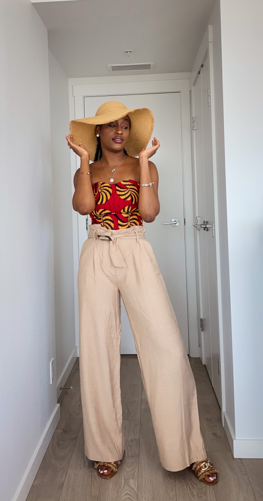 - With Linen shorts or pants: Linen is pretty big this summer so it is on brand for me to pair this with linen. Ankara and Linen is an unlikely pair but it turned out looking nice. Added a straw hat to give it that summer/vacation look.