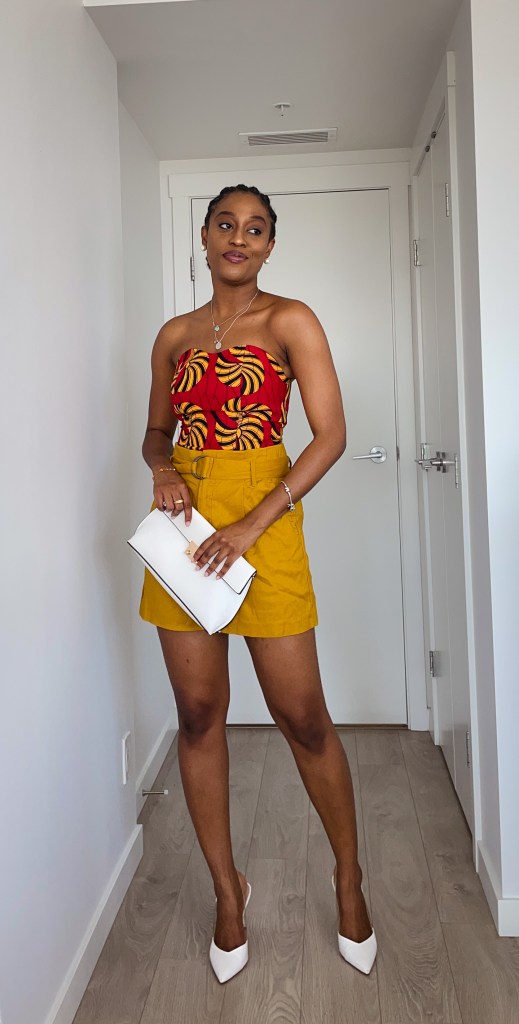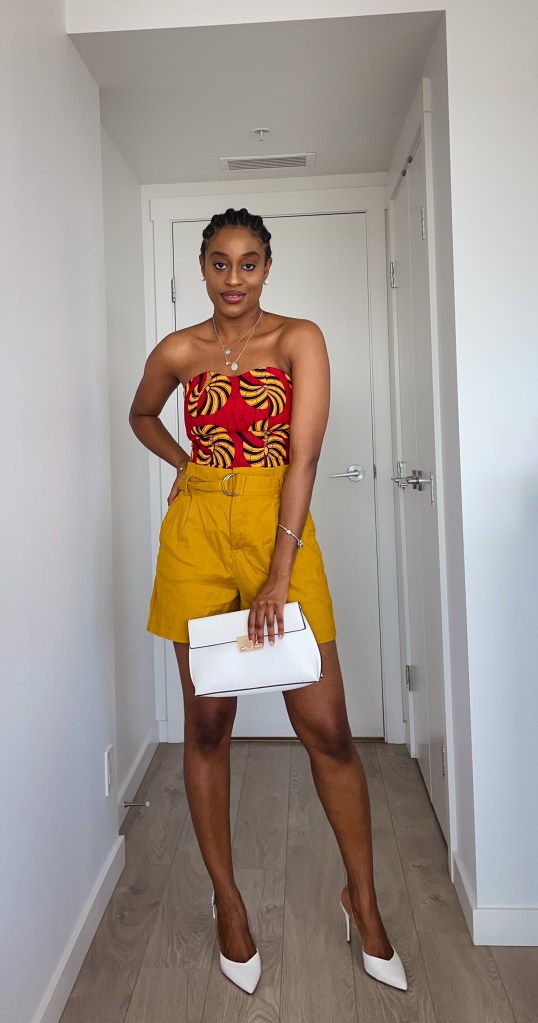 With plain colored shorts that contrast with the prints on the top: I picked these mustard paper bag shorts I bought last summer. They are a bit big for me which since I like the loose fit. The mustard contrasts well with the mustard on the top. I threw in some more color and added these white mules and a white purse. The matching bad and shoes is very much giving 2000’s mummy vibes – I’m not mad at that.