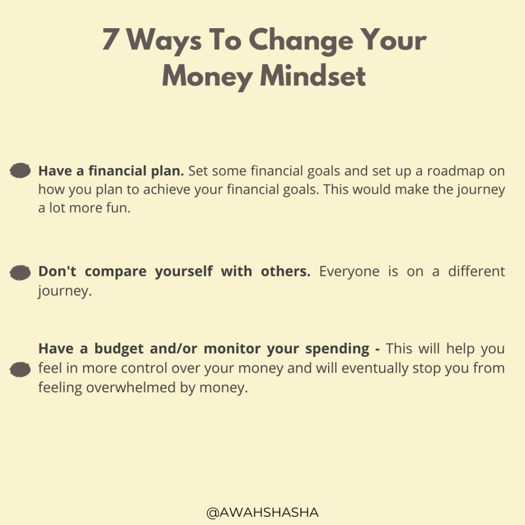 Read more: 7 Ways to Change Your Money MindsetWhen your money mindset changes, you could go from a place of fear, stress and anxiety when it comes to money to abundance, peace and feeling in control of your finances/money. If you’ve found yourself setting financial goals and not believing you could achieve them or not setting them at all because they seemed impossible, this might be an indicator that your relationship and view of money might be negative.